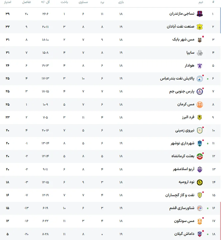 جدول لیگ آزادگان پس از پایان روز اول هفته نوزدهم