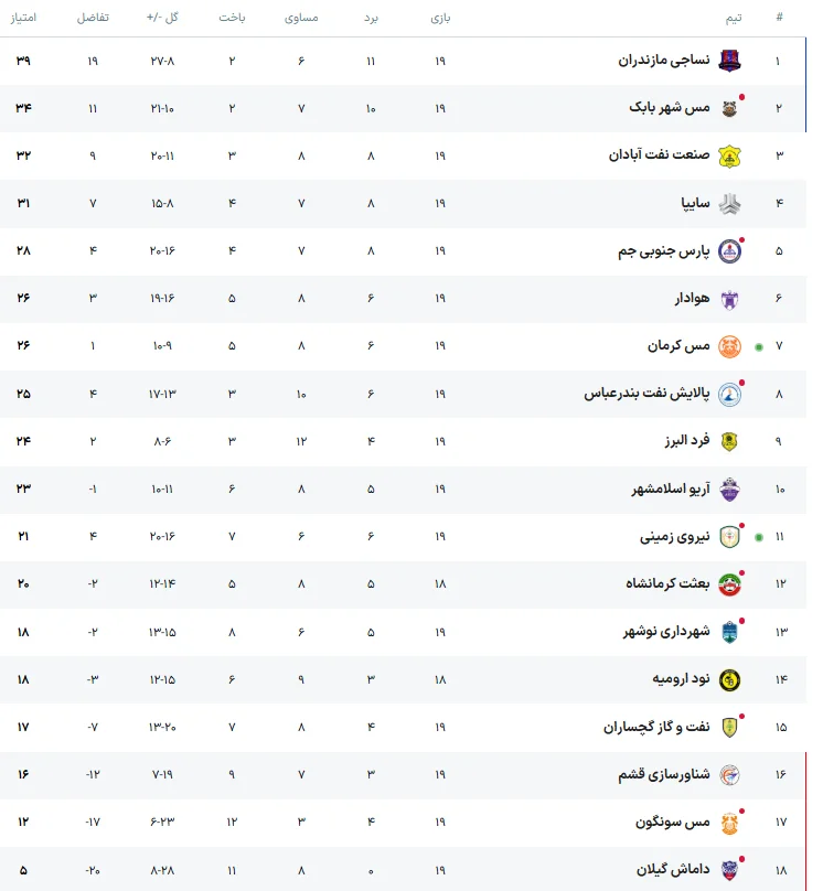 جدول لیگ آزادگان پس از پایان هفته نوزدهم
