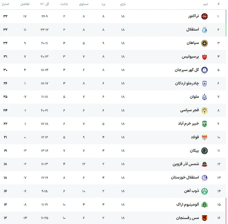 جدول لیگ برتر پس از پایان هفته هجدهم