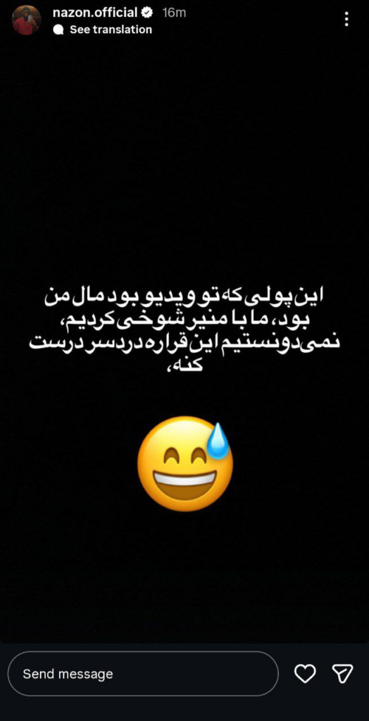 گویا مدیران استقلال از این بازیکن جنجالی خواستند شرط بندی را تکذیب کند. نازون هم به ناچار در صفحه شخصی خود یک استوری جدید منتشر کرد و نوشت؛