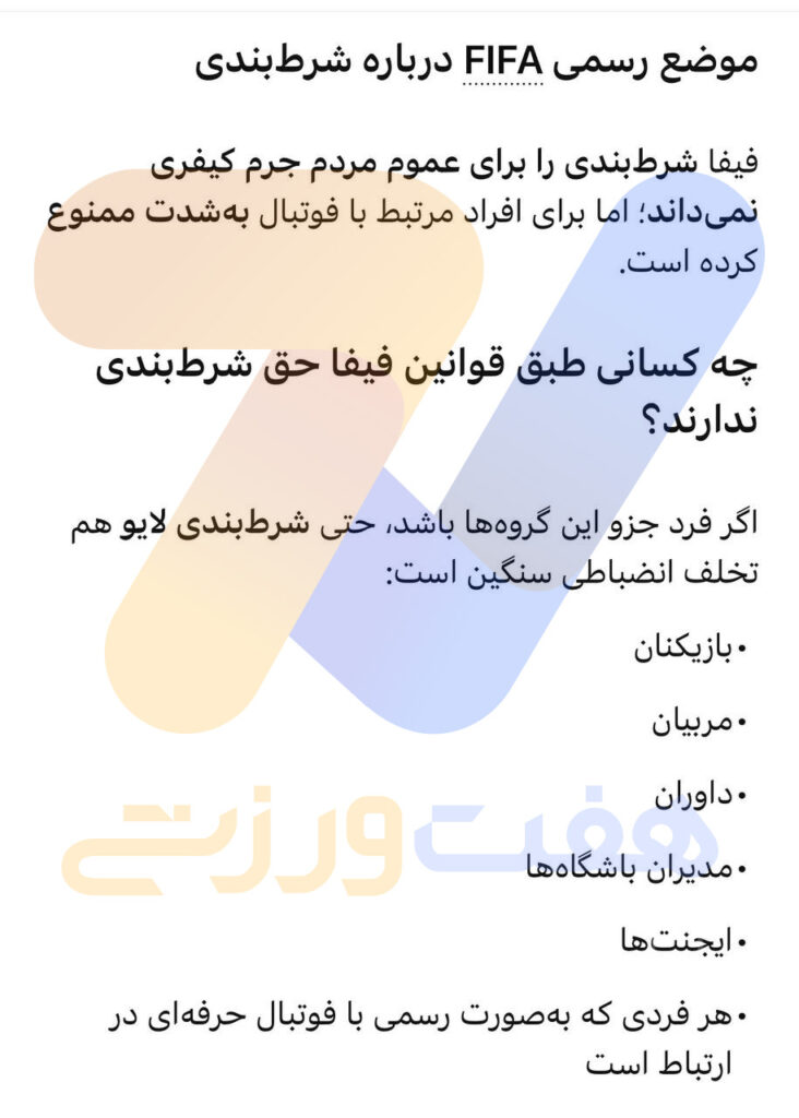 فیفا می گوید هر فردی که به صورت رسمی با فوتبال حرفه ای در ارتباط است، چه بازیکن و مربی و چه ایجنت و داور، حق شرط بندی ندارد.