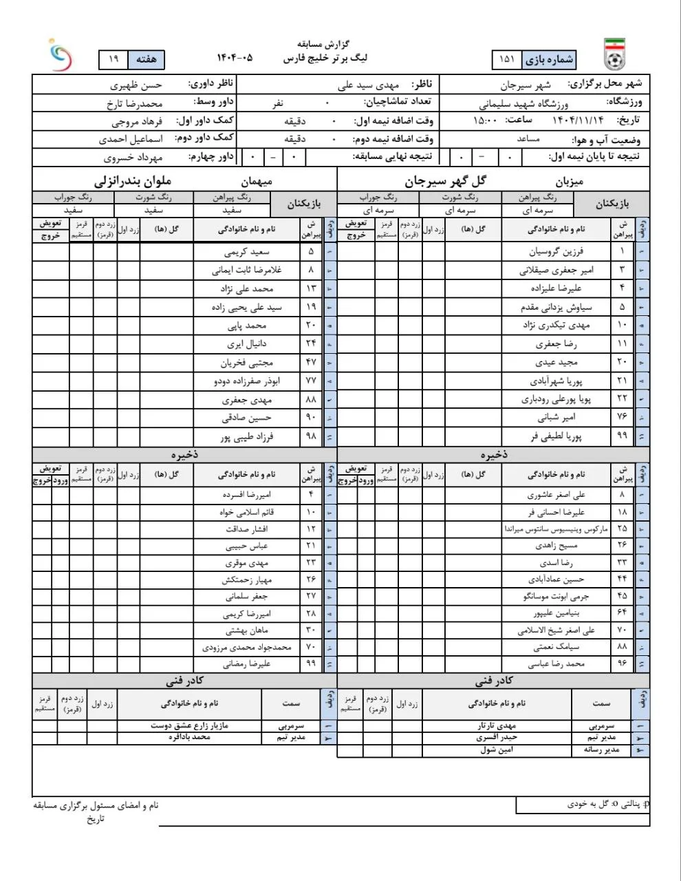 ترکیب تیم های فوتبال گل گهر و ملوان اعلام شد.