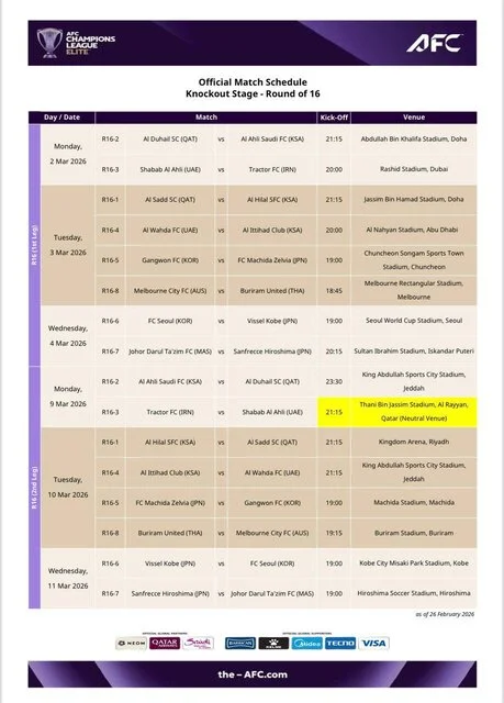 با تایید کنفدراسیون فوتبال آسیا، تراکتور در دیدار برگشت مرحله یکهشتم نهایی لیگ نخبگان آسیا در ورزشگاه ثانی بن جاسم قطر میزبان شبابالاهلی خواهد بود.