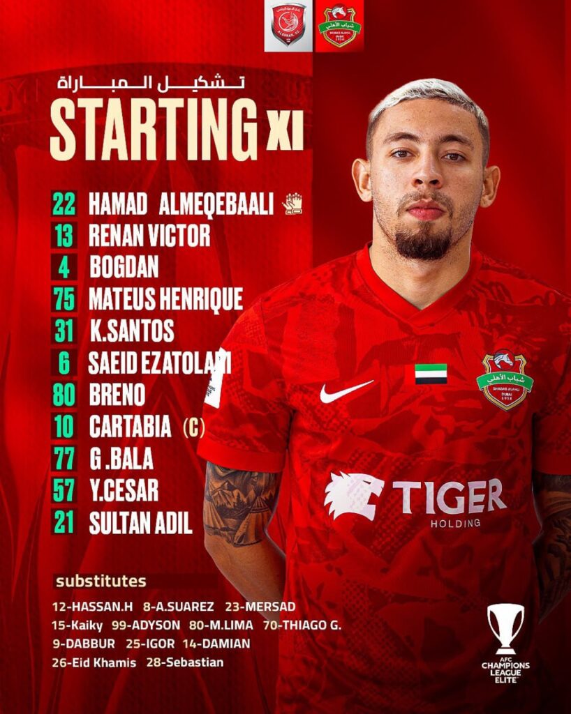 سعید عزتاللهی، هافبک ملیپوش ایرانی شباب الاهلی، در ترکیب اصلی تیمش حضور دارد. او در سه بازی گذشته این رقابتها عملکرد درخشانی داشته؛ یک گل سهامتیازی مقابل الاتحاد عربستان به ثمر رسانده و در دیدار با نسف قارشی ازبکستان نیز پاس گل داده است.