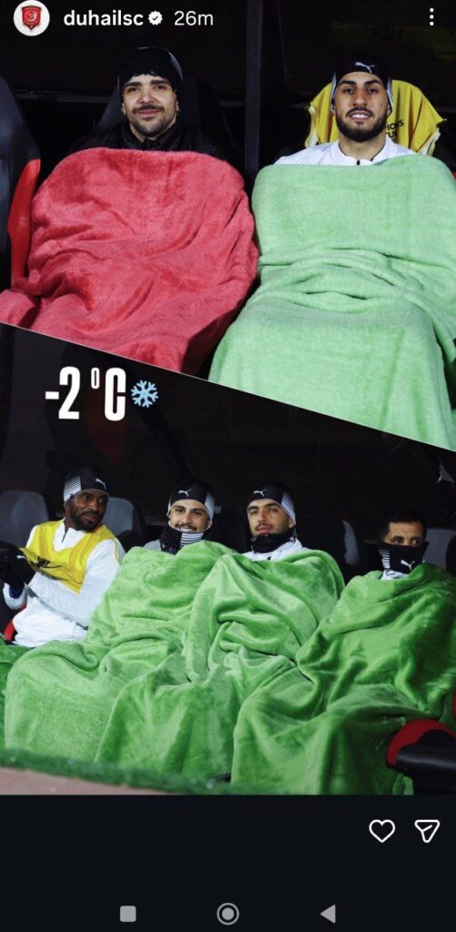 به گزارش هفت ورزشی، پیج رسمی باشگاه الدحیل قطر در اینستاگرام، تصویری از بازیکنان این تیم روی نیمکت ورزشگاه یادگار امام تبریز منتشر کرد؛ جایی که بازیکنان الدحیل به دلیل سرمای هوا با پتو نشستهاند. این باشگاه در توضیح این استوری عدد -۲ را درج کرد تا به دمای هوا اشاره کند.