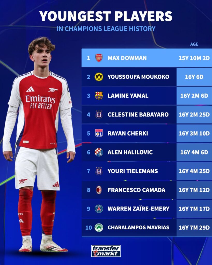 مکس داومن، استعداد شگفتانگیز آرسنال، با حضور در دیدار برابر اسلاویا پراگ، به جوانترین بازیکن تاریخ لیگ قهرمانان اروپا تبدیل شد.