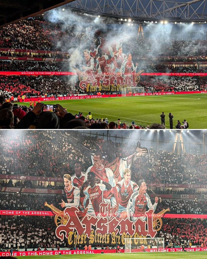 این نمایش چشم‌نواز که با هماهنگی کامل هزاران هوادار، کارت‌های رنگی، دود قرمز و سفید و تصویر بزرگ اسطوره‌های آرسنال همراه بود، فضای امارات را برای لحظاتی در سکوتی پرهیجان فرو برد. ترکیب نورافکن‌ها با این طرح باشکوه حال‌وهوایی سینمایی ایجاد کرد و به‌نوعی یادآور تاریخ پرافتخار باشگاه بود.