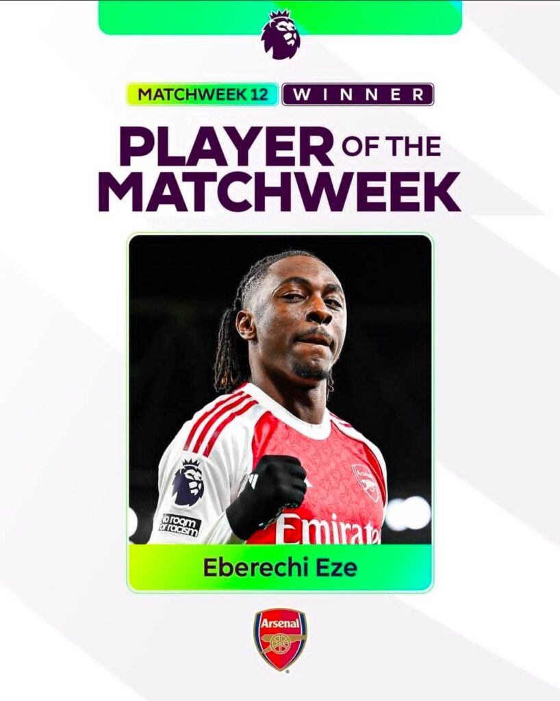 به گزارش هفت ورزشی، ابرچی ازه، وینگر تکنیکی آرسنال، با نمایش خیره‌کننده‌اش مقابل تاتنهام و ثبت هت‌تریک، به‌عنوان بهترین بازیکن هفته دوازدهم لیگ برتر انگلیس انتخاب شد.