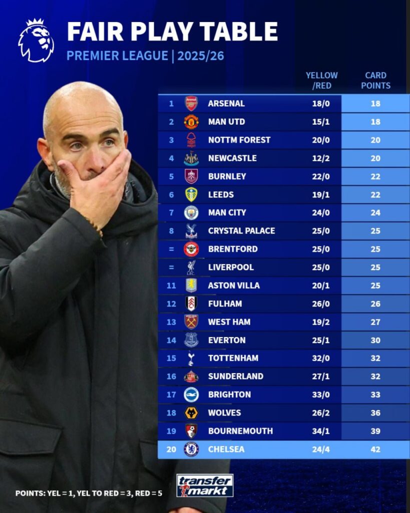 بر اساس آمار منتشر شده پس از مسابقات اخیر، چلسی با مجموع ۲۴ کارت زرد و ۴ کارت قرمز، خشنترین تیم حال حاضر لیگ محسوب میشود؛ تیمی که در بازی شب گذشته مقابل صدرنشین نیز عملکردی پر برخورد داشت.