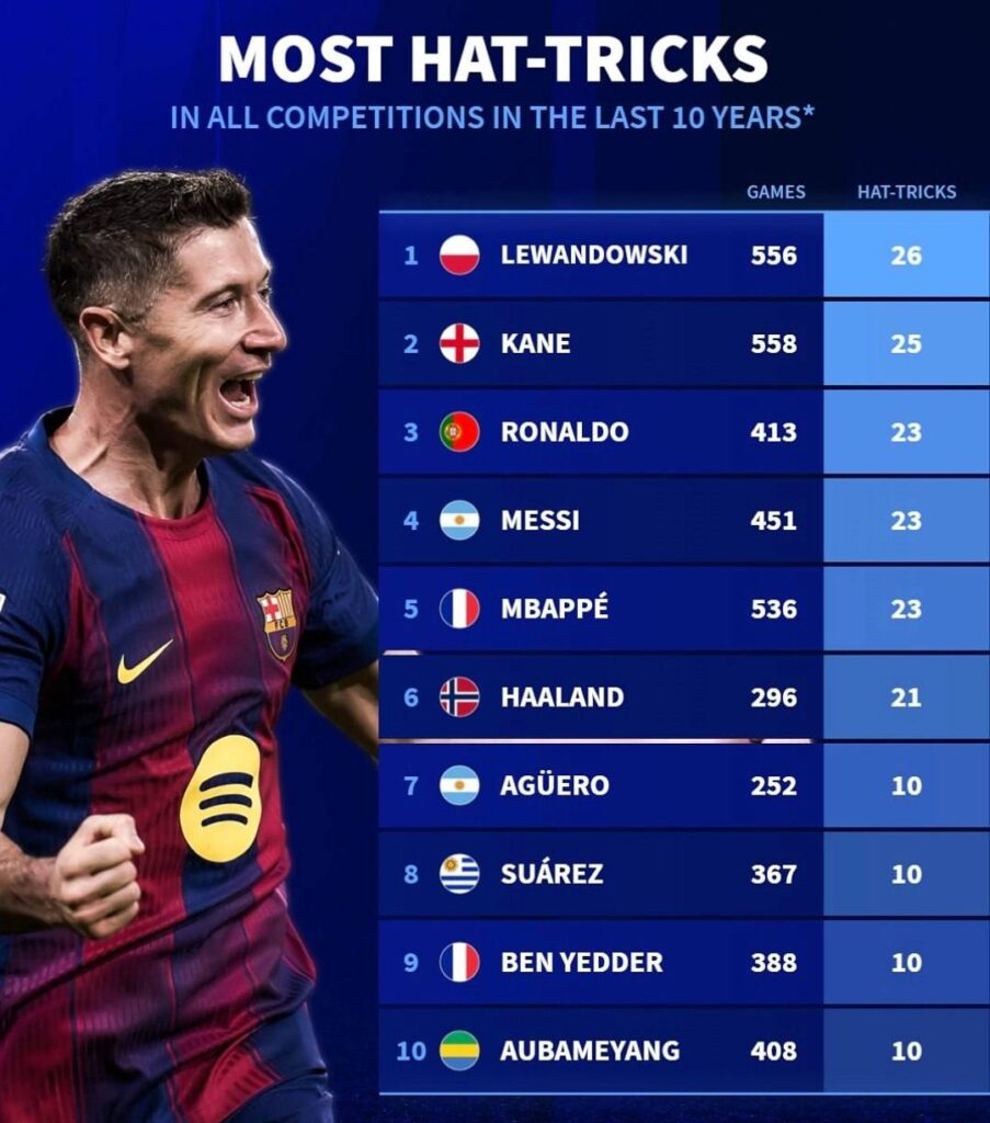 به گزارش هفت ورزشی، روبرت لواندوفسکی، مهاجم گلزن بارسلونا، در یک دهه گذشته با ثبت ۲۶ هتریک در تمامی رقابتها، بالاتر از تمام ستارگان فوتبال جهان ایستاده است.