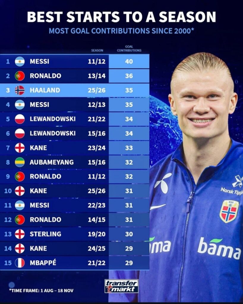 به گزارش هفت ورزشی، با وجود شروع طوفانی ارلینگ هالند در فصل جدید، او باز هم نتوانست از رکوردهای خارقالعاده لیونل مسی و کریستیانو رونالدو عبور کند. مسی با ۴۰ و رونالدو با ۳۶ اثرگذاری (گل + پاسگل) همچنان رکورددار بیشترین اثرگذاری از ابتدای فصل تا ۱۸ نوامبر در قرن ۲۱ هستند.