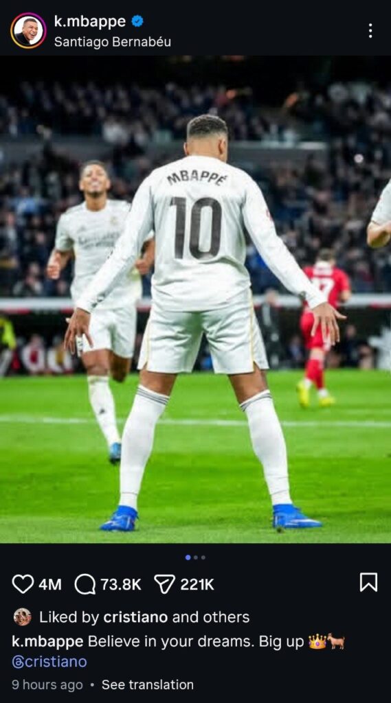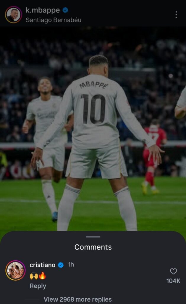 کریستیانو رونالدو هم ساعاتی بعد به این اقدام واکنش نشان داد و با چند ایموجی آتش و دستهای رو به بالا، احترام و تحسین خود را نسبت به امباپه ابراز کرد؛ واکنشی که از سوی هواداران فوتبال بهعنوان نمادی از پیوند دو نسل از ستارههای بزرگ دنیای فوتبال تعبیر شد.