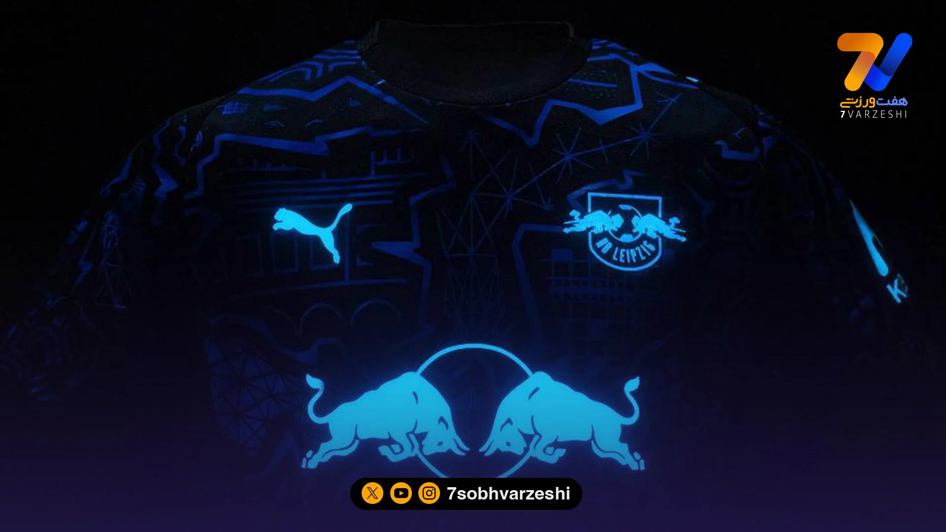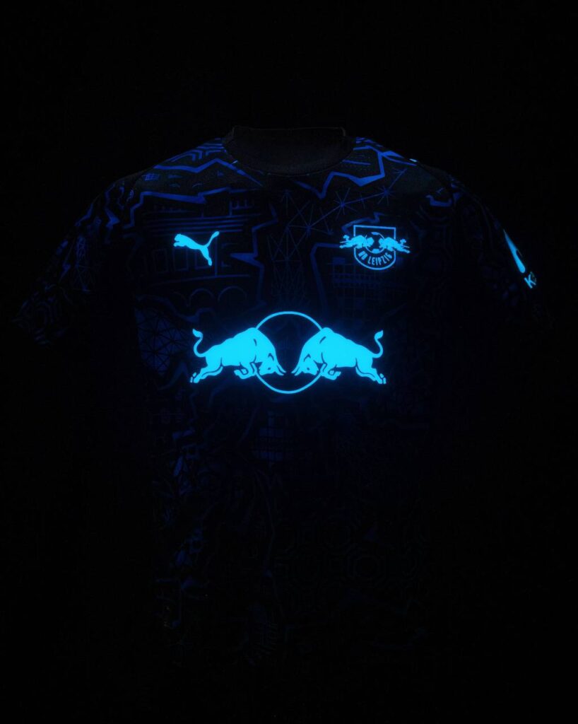 لایپزیش با همکاری پوما از پیراهن ویژه فصل 26-2025 رونمایی کرد؛ کیتی مشکی و آبی با لوگوهای شبتاب که در تاریکی جلوهای متفاوت و خیرهکننده دارد.