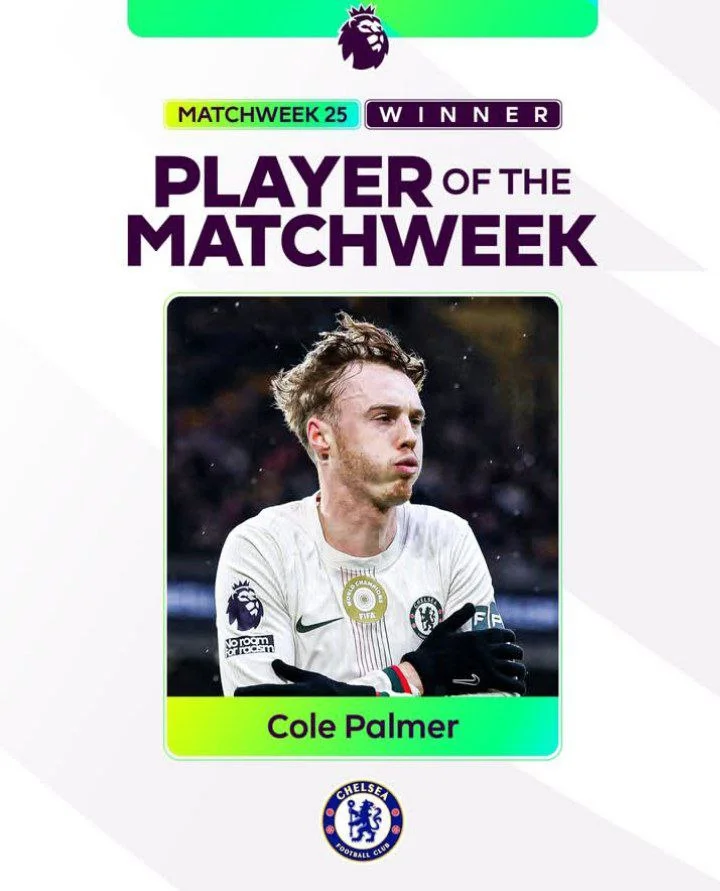 بدین ترتیب کول پالمر ستاره 24 ساله چلسی به عنوان بهترین بازیکن هفته بیست و پنجم لیگ برتر انگلیس انتخاب شد.