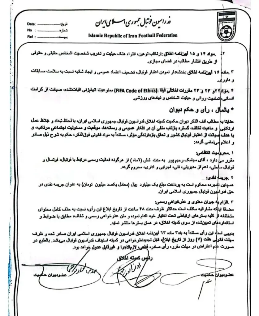 کمیته اخلاق به رحیمپور ۴۸ ساعت فرصت داده است تا به طور رسمی از اقدامات خود عذرخواهی کند؛ در غیر این صورت، محکومیتهای جدیدی برای او در نظر گرفته خواهد شد. رحیمپور که پیش از این بارها درباره مسائل اخلاقی فوتبال و فساد در فوتبال پایه اظهارنظر کرده بود، حالا باید با این حکم و پیامدهای آن روبرو شود.