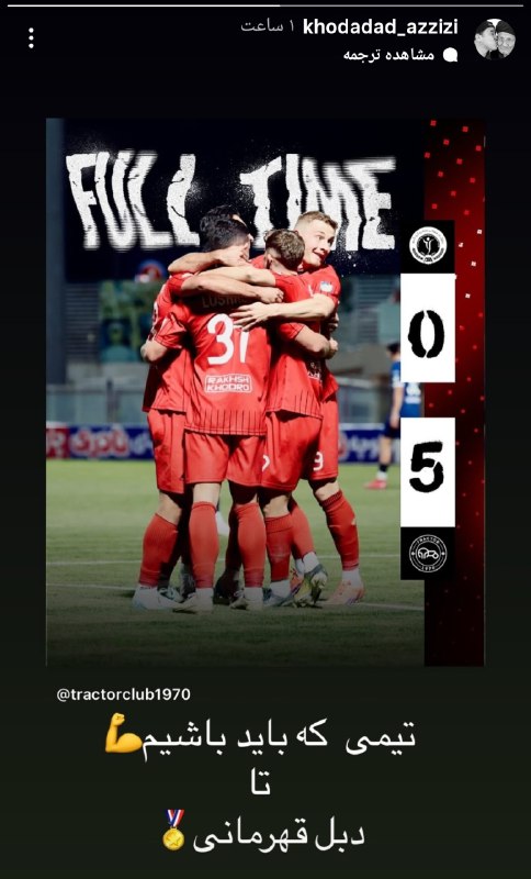 خداداد عزیزی، سرپرست تیم تراکتور، پس از پیروزی قاطع ۵ بر صفر تیمش مقابل گلگهر، با انتشار یک استوری جنجالی منتشر کرد.