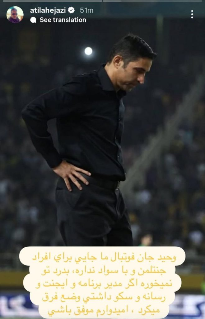 پس از برکناری وحید هاشمیان از سمت سرمربیگری تیم پرسپولیس، آتیلا حجازی با انتشار استوری، از او حمایت کرد و نوشت که فوتبال ایران جایی برای افراد “جنتلمن و با سواد” ندارد.