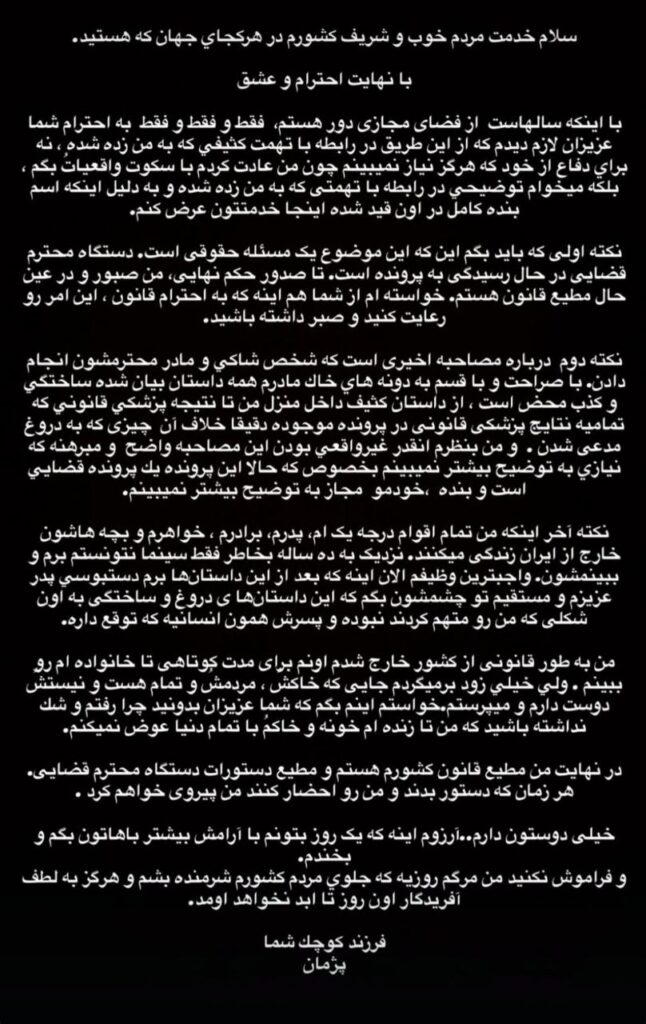 نکته دوم درباره مصاحبه اخیر است که شخص شاکی و مادر محترمشون انجام دادن. با صراحت و با قسم به روح پاک مادرم همه داستان بیانشده ساختگی و تماما نتیجه برداشتهای داخل منزل بنده بوده که رسیدگی قانونی دارد. مدعی شدن که رابطهای قانونی و شرعی دقیقاً خلاف آن است. چیزی که دروغ محض است، و من بنظرم انقدر غیرواقعی بودن این مصاحبه واضح و مبهمه که نیازی به توضیح بیشتر نیست. مخصوصاً که حالا این پرونده به پرونده قضایی است و بنده و خودم مجاز به توضیح بیشتر نیستیم.