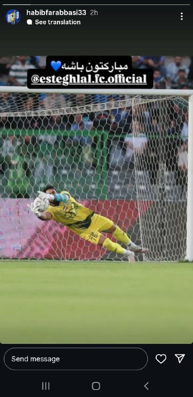 حبیب فرعباسی، دروازهبان استقلال که در جریان دیدار با آلومینیوم اراک دچار مصدومیت شد و زمین را ترک کرد، با انتشار استوری کوتاهی پس از مسابقه به هواداران تیمش تبریک گفت.