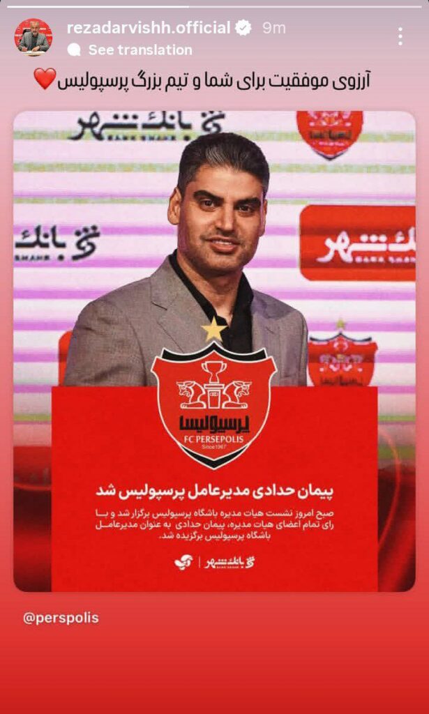 به گزارش هفت ورزشی، بعد از اعلام رسمی باشگاه پرسپولیس مبنی بر انتصاب پیمان حدادی به عنوان مدیرعامل جدید، رضا درویش، مدیرعامل سابق این باشگاه، با انتشار استوری در صفحه شخصی خود واکنش نشان داد.