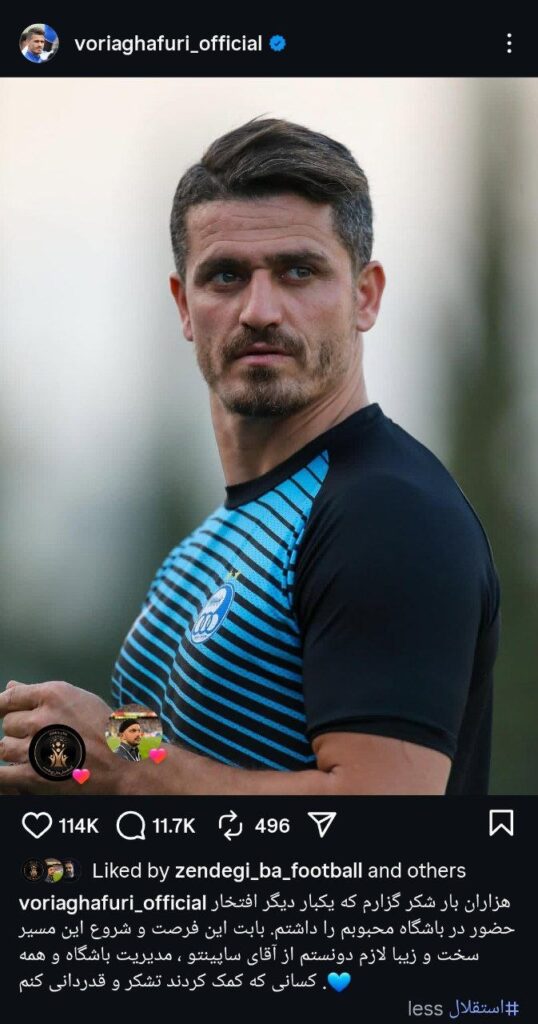 به گزارش هفت ورزشی، وریا غفوری، کاپیتان سابق استقلال که بهتازگی به جمع اعضای کادر فنی این تیم اضافه شده، پس از چند روز سکوت با انتشار پستی در اینستاگرام از بازگشت دوبارهاش به تیم محبوبش ابراز خوشحالی کرد.