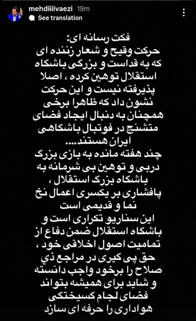 درحالی که پرسپولیسی ها خیلی زود این فیلم اهانت آمیز را از فضای رسانه ای خود حذف کردند، مهدی واعظی مدعی شد پرسپولیسی ها به دنبال ایجاد فضای متشنج در فوتبال هستند.