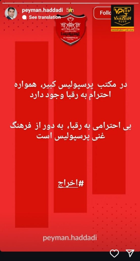 پیمان حدادی، مدیرعامل پرسپولیس، با انتشار استوری در صفحه اینستاگرام خود نوشت: