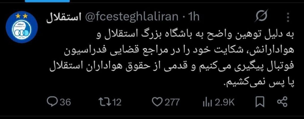 «به دلیل توهین واضح به باشگاه بزرگ استقلال و هوادارانش، شکایت خود را در مراجع قضایی فدراسیون فوتبال پیگیری میکنیم و قدمی از حقوق هواداران استقلال پا پس نمیکشیم.»