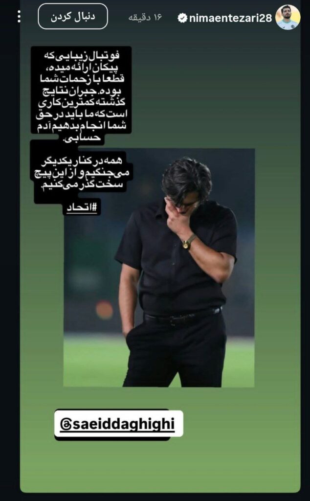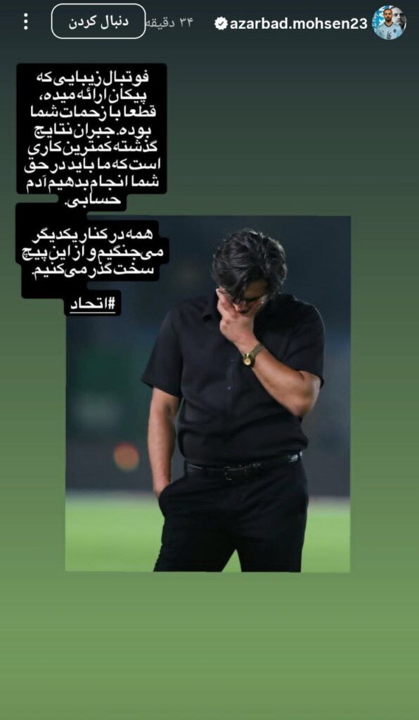 «فوتبال زیبایی که پیکان ارائه میدهد، حاصل زحمات شماست. جبران نتایج گذشته کمترین کاری است که ما باید در حق شما انجام دهیم آدم حسابی! همه در کنار هم میجنگیم و از این پیچ سخت عبور میکنیم. #اتحاد»