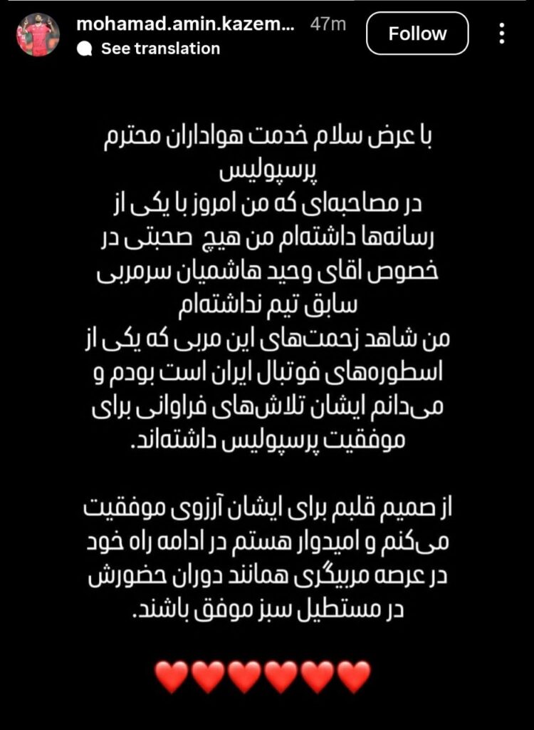 کاظمیان اما دقایقی قبل با انتشار یک استوری تمام گفته هاش علیه هاشمیان را تکذیب کرد. مشخص نیست این بازیکن از ابتدا حرفی علیه سرمربی سابق پرسپولیس نزده بود یا حالا پشیمان شده و حرف هایش را پس گرفته است.