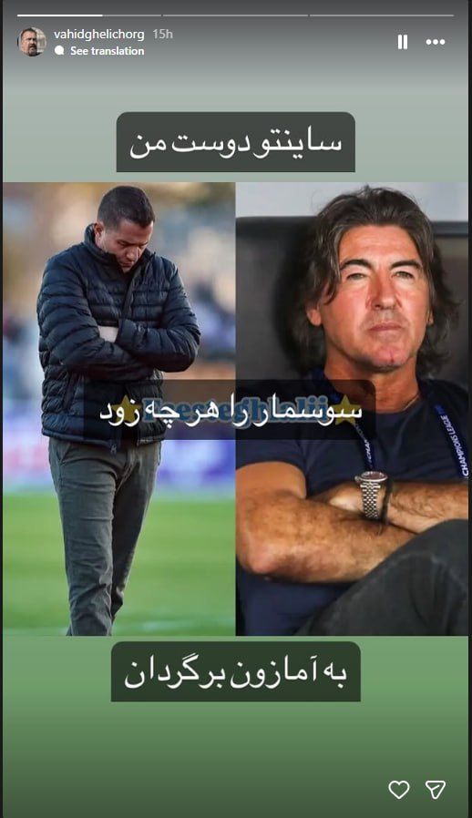 به گزارش هفت ورزشی، وحید قلیچ، بازیکن و دروازهبان پیشین پرسپولیس، با انتشار استوری تازهای در فضای مجازی بار دیگر خبرساز شد. او در این استوری عکسی از ریکاردو ساپینتو، سرمربی استقلال و اوسمار ویرا، سرمربی پرسپولیس، منتشر کرد و در توضیح آن نوشت: