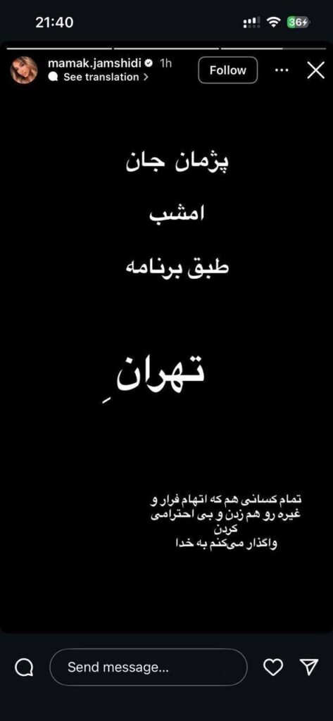 خواهر پژمان جمشیدی با انتشار یک استوری خبر داد برادرش امشب به تهران بازگشته است…