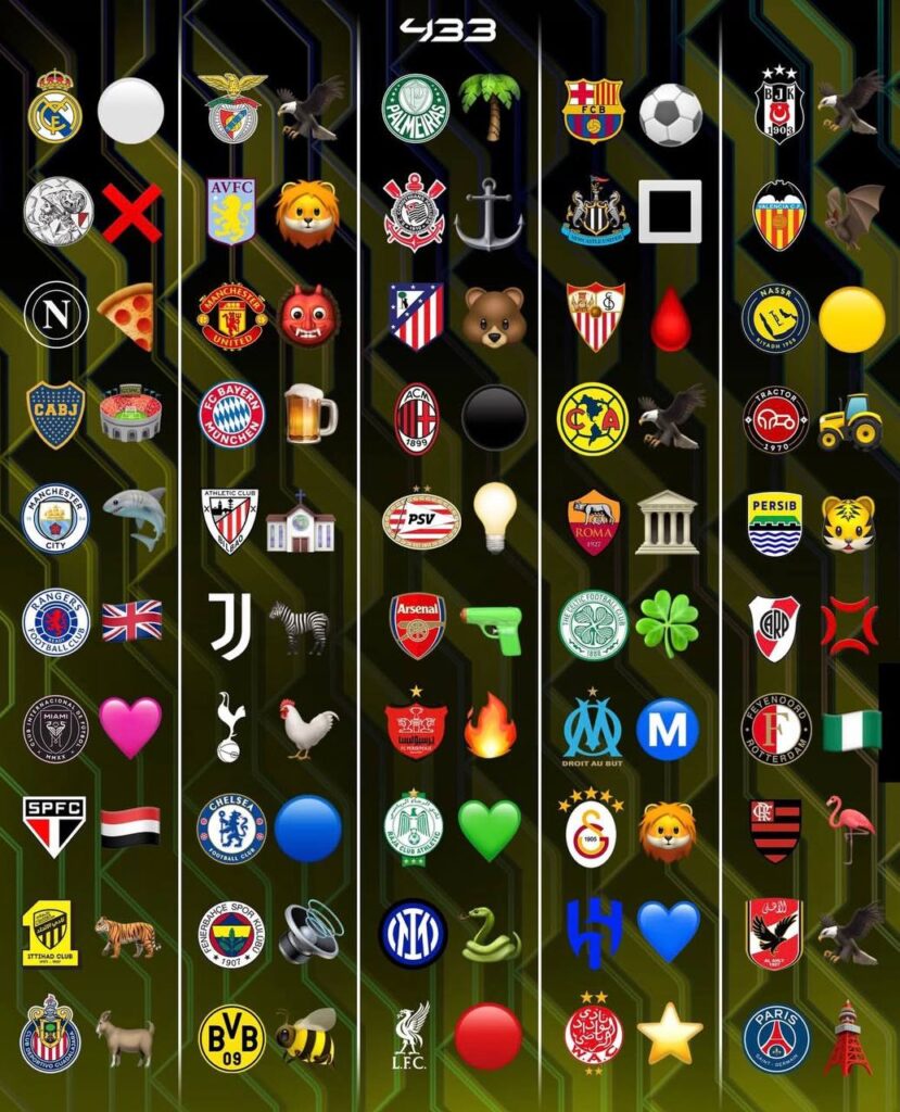 به گزارش هفت ورزشی، صفحه اینستاگرامی معروف ۴۳۳ در پستی لوگوی پنجاه تیم از سراسر جهان را مقابل ایموجیهای مرتبط با آنها قرار داده است.