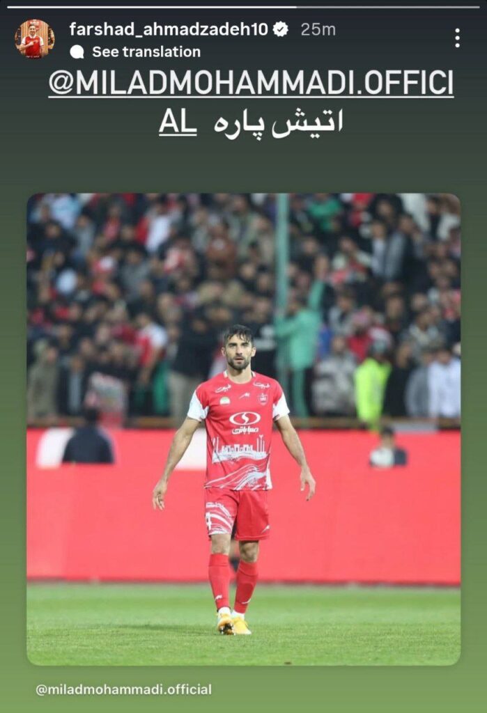 فرشاد احمدزاده، وینگر پرسپولیس، با انتشار یک استوری طنز و حمایتی، تصویری از میلاد محمدی را به اشتراک گذاشت و در توضیح آن نوشت: «آتیشپاره».