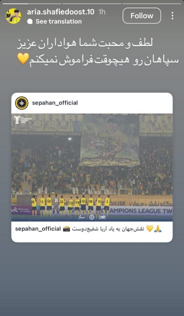 آریا شفیعدوست، بازیکن سپاهان، پس از حمایت هواداران این تیم در ورزشگاه نقشجهان، با انتشار استوری احساسی از آنها قدردانی کرد.