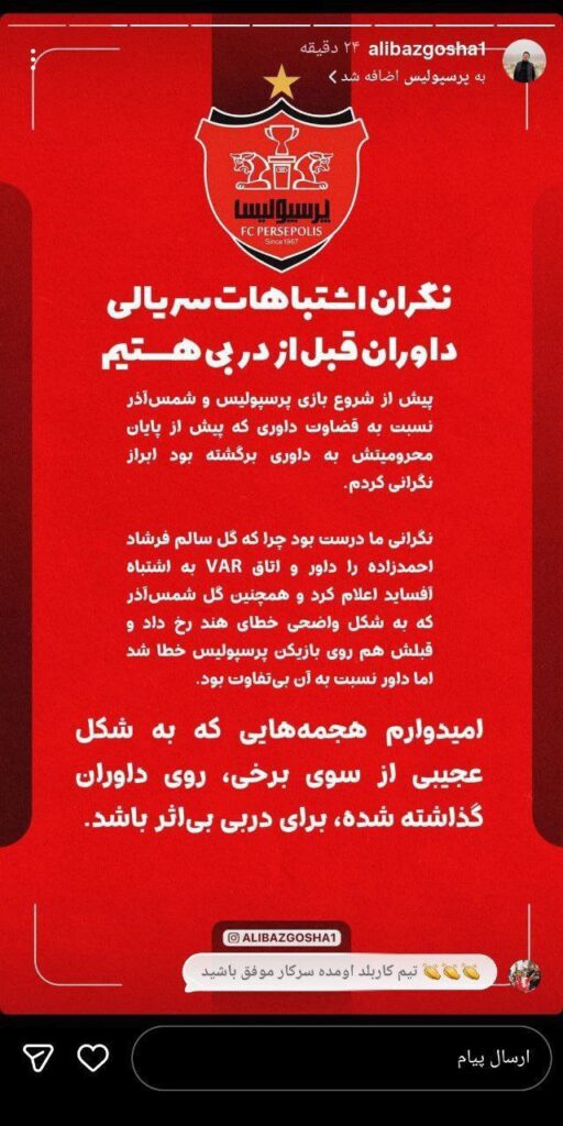 به گزارش هفت ورزشی، علی بازگشا، مدیر روابط عمومی باشگاه پرسپولیس، با انتشار یک استوری نسبتا طولانی در واکنش به رخدادهای داوری بازی مقابل شمسآذر نوشت: «نگران اشتباهات سریالی داوران قبل از دربی هستیم.»