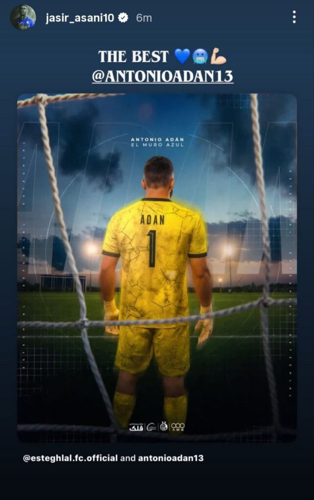 یاسر آسانی پس از درخشش آنتونیو آدان و مهار پنالتی مقابل فولاد، با انتشار استوری و عبارت «the best» از گلر اسپانیایی استقلال حمایت کرد.