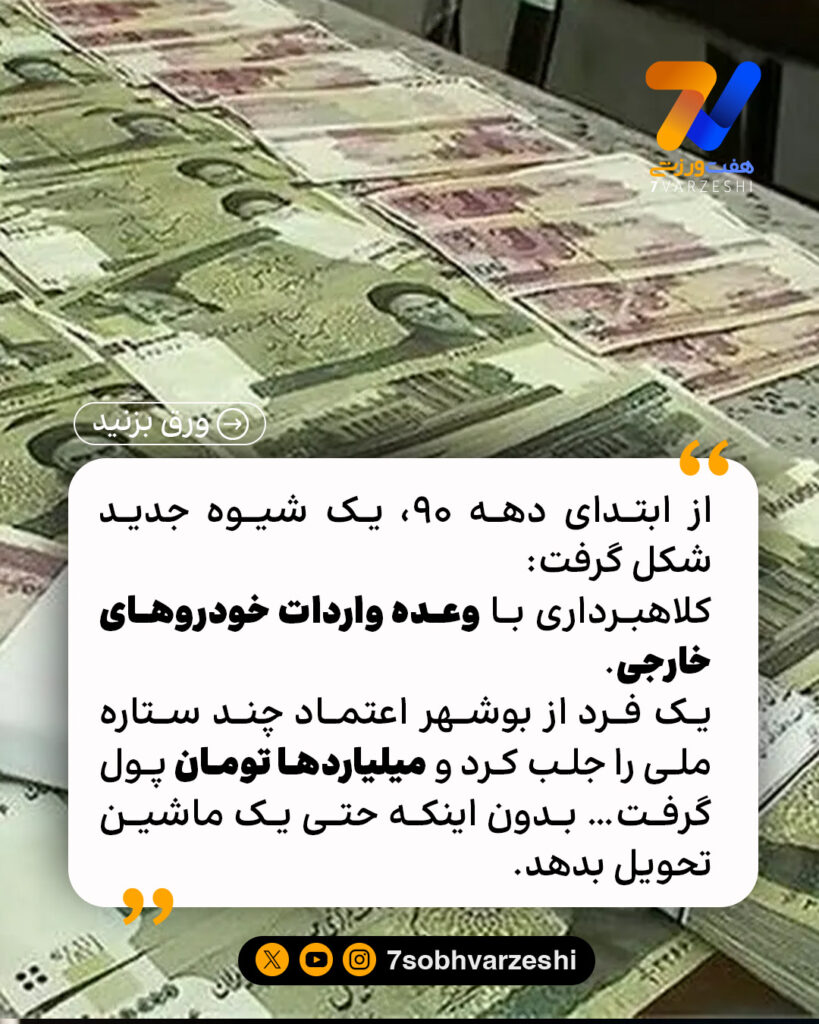 اوایل این دهه بود که یک نفر از بوشهر، اعتماد چند بازیکن معروف و ملی پوش رو جلب کرد و به بهانه واردات ماشین، رقم هایی در حد یک تا 5 میلیارد از اونها گرفت، بدون اینکه ماشینی در کار باشه.