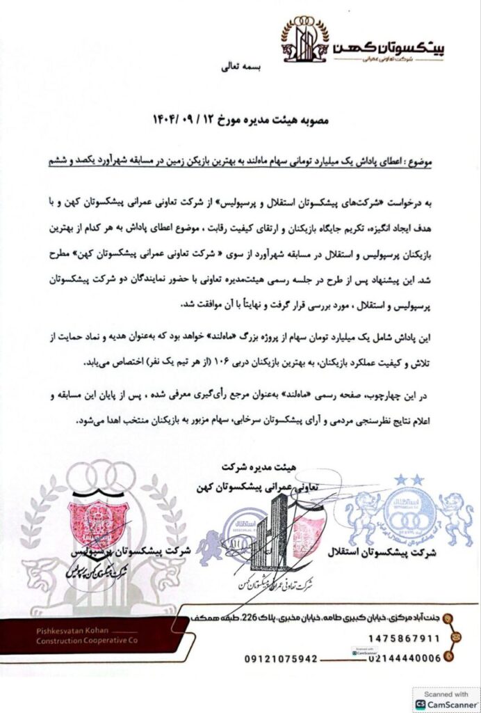 بر اساس مصوبه نهایی، شرکت تعاونی عمرانی پیشکسوتان کهن، بهترین بازیکنان زمین در مسابقه دربی پایتخت که با رأی مردمی در صفحه رسمی «ماهلند» انتخاب میشوند، مشمول دریافت پاداشی ویژه خواهند شد. این پاداش شامل یک میلیارد تومان سهام از پروژه بزرگ «ماهلند» خواهد بود که بهعنوان هدیه و نماد حمایت از تلاش و کیفیت عملکرد بازیکنان، به بهترین بازیکنان دربی ١٠۶ اختصاص مییابد.