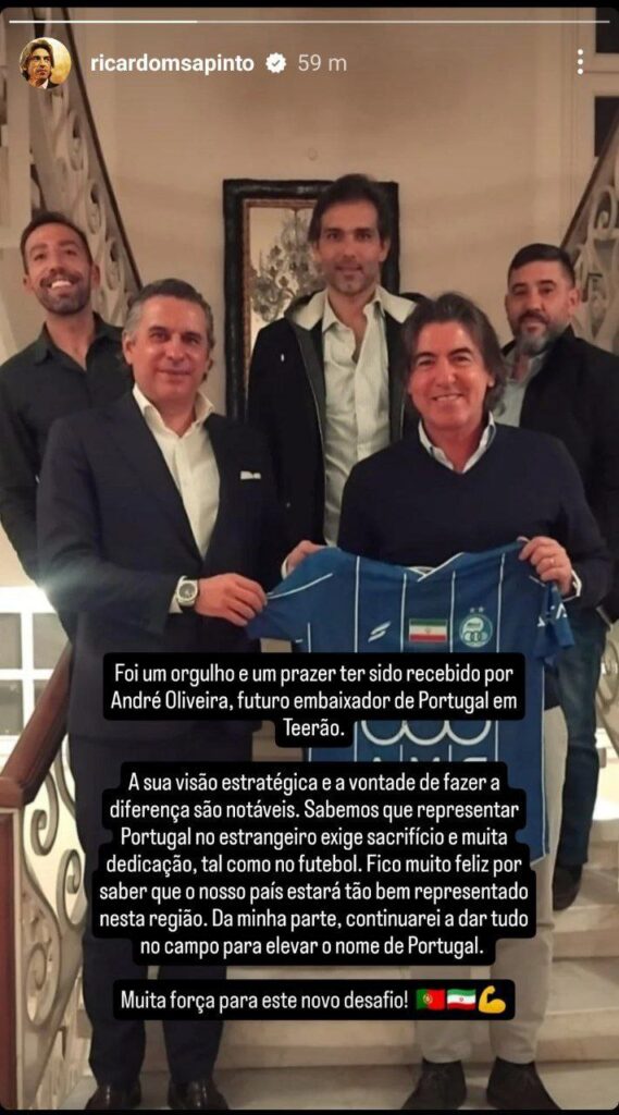 «باعث افتخار و خرسندی بود که مورد استقبال آندره اولیویرا، سفیر آینده پرتغال در تهران قرار گرفتم. دیدگاه استراتژیک و تمایل او برای ایجاد تغییر قابل توجه است. ما میدانیم که نمایندگی پرتغال در خارج از کشور، درست مثل فوتبال، نیاز به فداکاری و از خودگذشتگی زیادی دارد.»