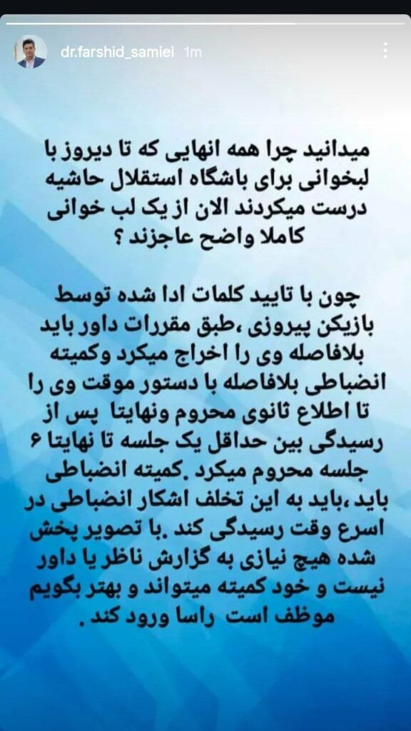 متن کامل استوری فرشید سمیعی به شرح زیر است: