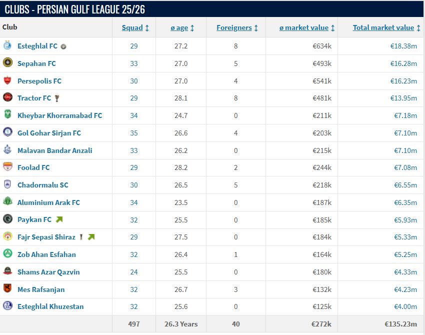 به گزارش هفت ورزشی، استقلال با 29 بازیکن، میانگین سنی 27 سال و دو ماه، هشت خارجی و 18/38 میلیون یورو با ارزش ترین تیم لیگ برتر ایران است.