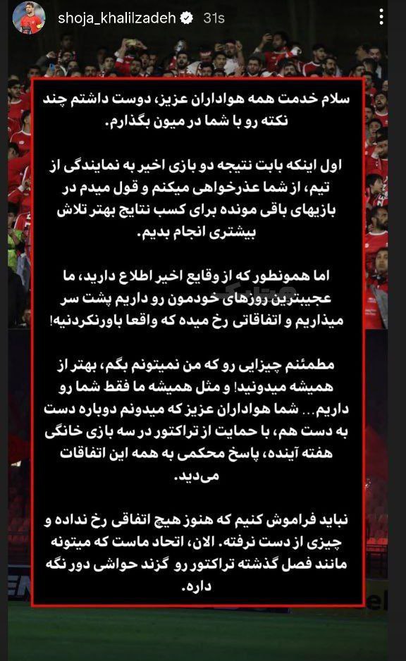 به گزارش هفت ورزشی، شجاع خلیلزاده، کاپیتان تیم تراکتور، پس از تساوی بدون گل این تیم مقابل ذوبآهن، با انتشار استوریای مفصل نسبت به شرایط اخیر باشگاه واکنش نشان داد و از هواداران عذرخواهی کرد.
