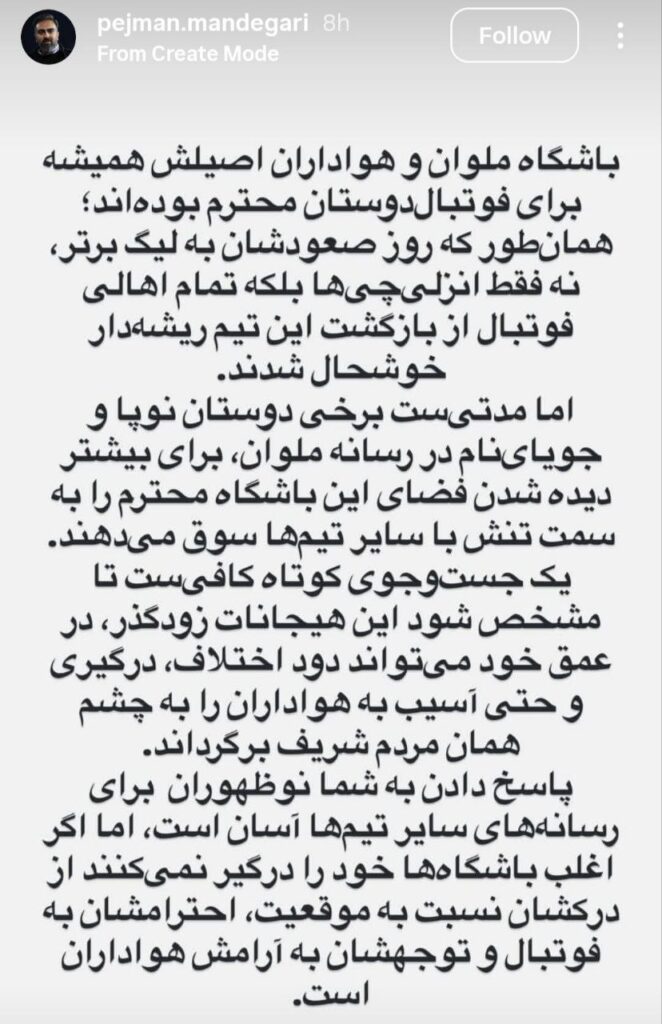 به گزارش هفت ورزشی، بازی تیمهای استقلال و ملوان از هفته سیزدهم لیگبرتر با نتیجه 1-1 به پایان رسید اما این به معنای پایان داستان نبود چرا که بعد از بازی رسانههای نزدیک به استقلال و سپس رسانههای نزدیک به ملوان صحنههایی از بازی را به عنوان پایمال شدن حقشان در این بازی منتشر کردند. در ادامه این درگیری مجازی پژمان ماندگاری مدیررسانهای استقلال با متنی تند نسبت به اتفاقات اخیر و رفتار رسانهای ملوان واکنش نشان داد. در این متن که در اینستاگرام مدیررسانهای باشگاه استقلال بارگذاری شده آمده است:
