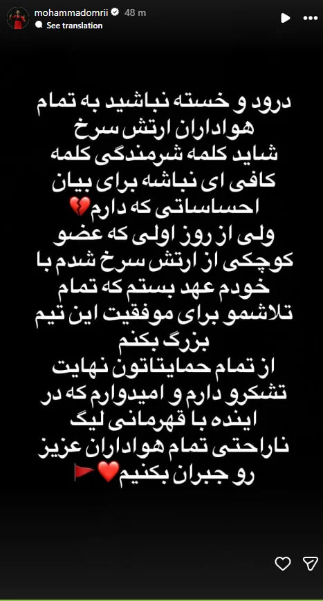 محمد عمری با انتشار استوری، از هواداران پرسپولیس قدردانی و بابت نتایج اخیر عذرخواهی کرد و قول داد با قهرمانی در لیگ دل آنها را شاد کند.