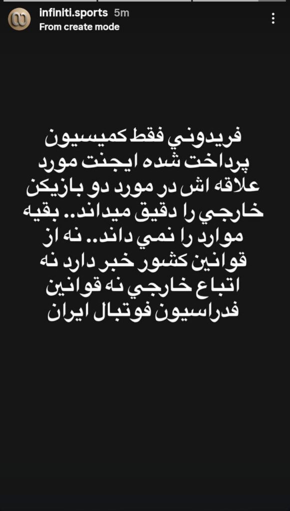 در متن این استوری آمده است که «فریدونی فقط کمیسیون پرداختشده را بهدقت محاسبه کرده اما درباره باقی موارد اطلاعی ندارد؛ نه از قوانین کشور خبر دارد، نه از قوانین مربوط به بازیکنان خارجی و نه حتی از مقررات فدراسیون فوتبال ایران.»