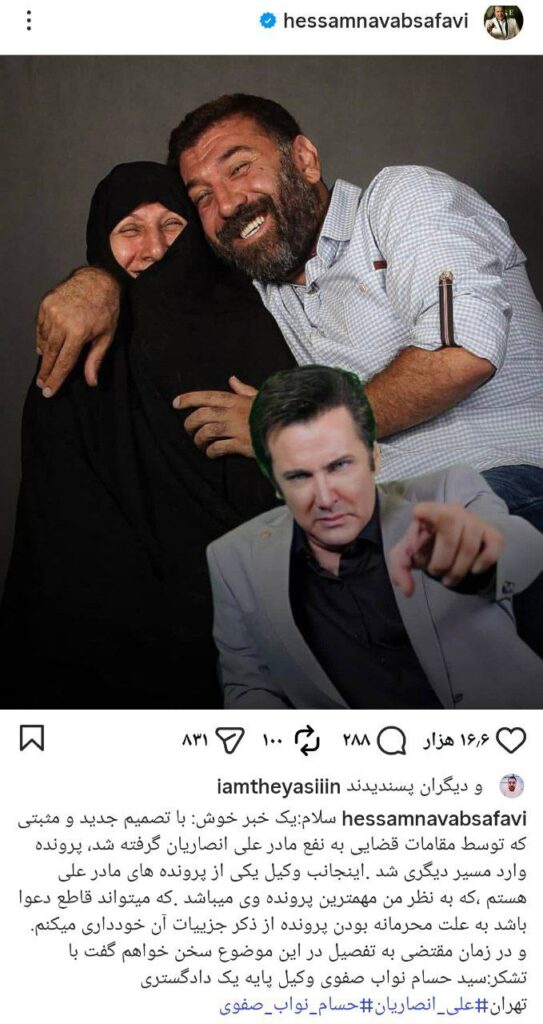 حسام نوابصفوی، بازیگر شناختهشده سینما و تلویزیون، با انتشار عکسی متفاوت در صفحه شخصی خود که حالوهوایی شبیه پوسترهای سینمایی دارد و در کنار تصویری از مرحوم علی انصاریان و مادر او منتشر شده، به تحولات تازه این پرونده اشاره کرد. او در توضیح این تصویر اعلام کرد که با اتخاذ تصمیمی مثبت و جدید، روند رسیدگی قضایی پرونده وارد مسیر تازهای شده است.