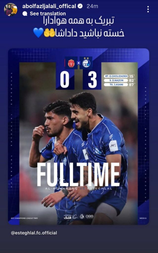 ابوالفضل جلالی که نامش از فهرست استقلال برای دیدار با المحرق خط خورده بود، پس از پیروزی پرگل آبیها با انتشار یک استوری به این برد واکنش نشان داد.