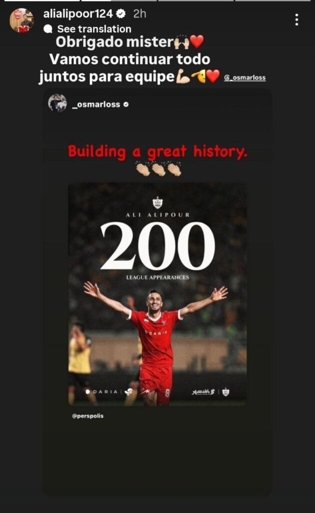 اوسمار ویرا با انتشار یک استوری، به رکورد ویژه علی علیپور در پرسپولیس واکنش نشان داد و از او بهعنوان بخشی از یک تاریخ بزرگ یاد کرد.