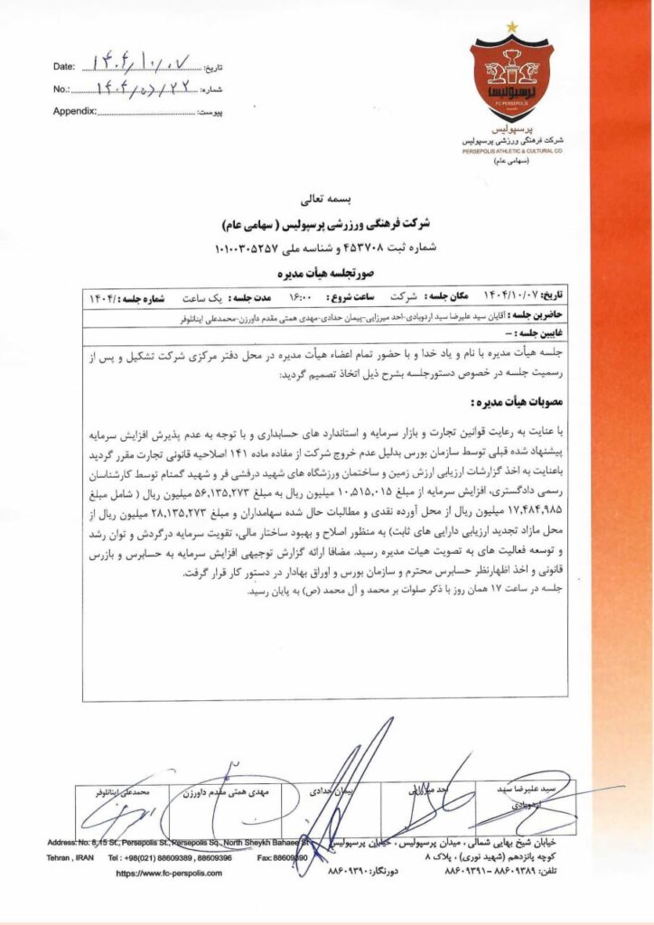 در پایان مقرر شد گزارش توجیهی افزایش سرمایه پس از تکمیل، برای طی مراحل قانونی به حسابرس، بازرس قانونی و سازمان بورس ارسال شود. در صورت نهایی شدن این فرآیند، پرسپولیس به نخستین باشگاه فوتبال ایران تبدیل خواهد شد که سرمایهای پنج هزار میلیارد تومانی را در سازمان بورس به ثبت میرساند.